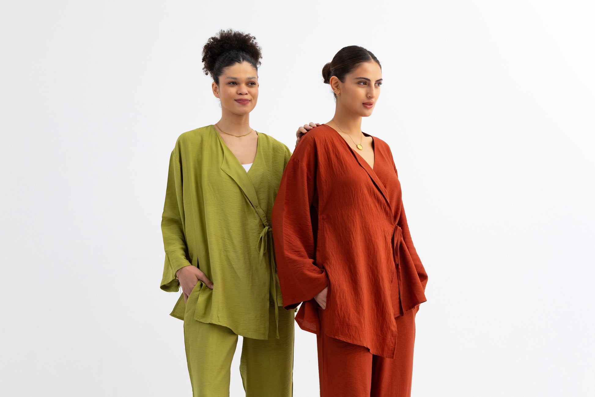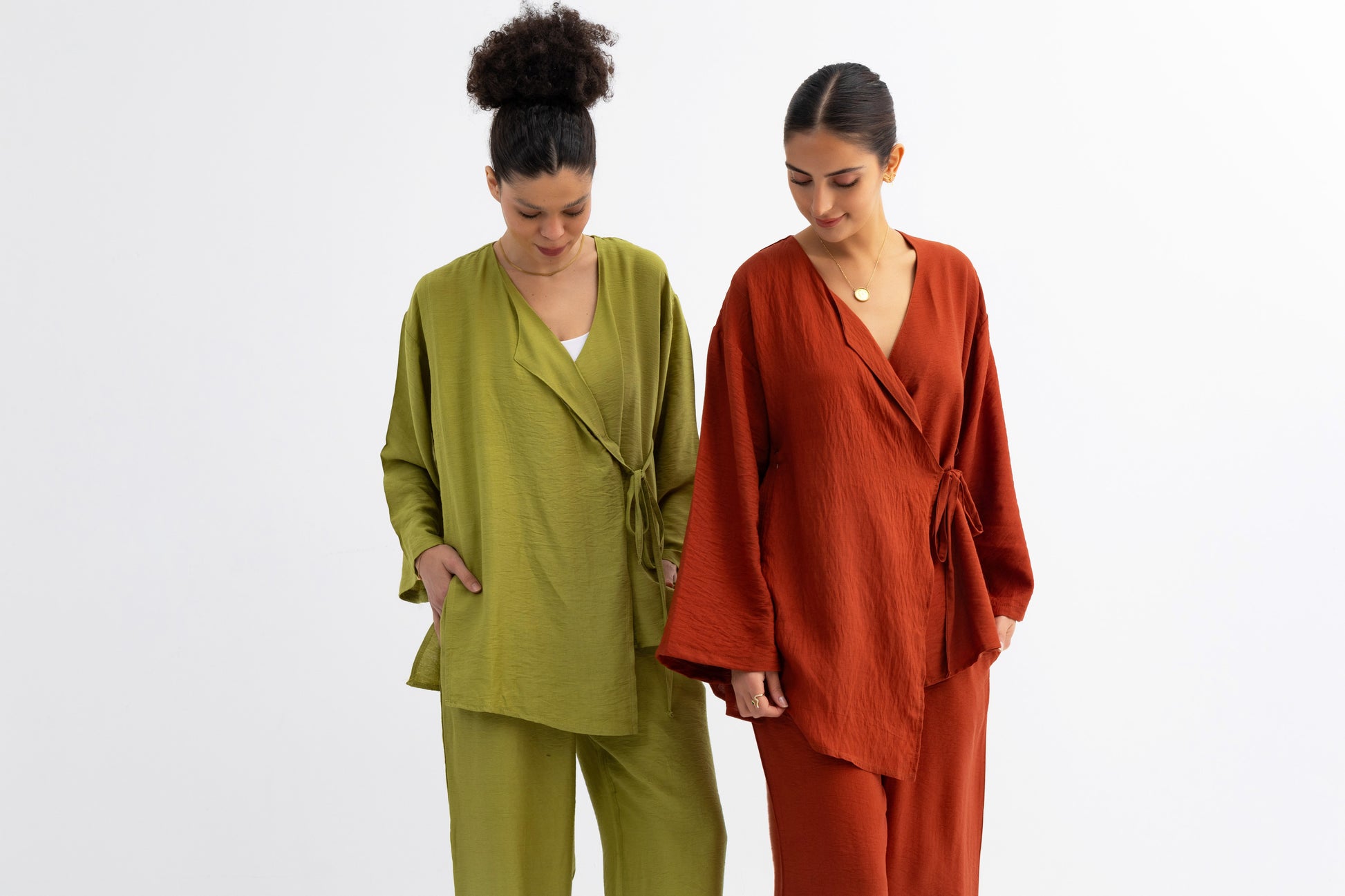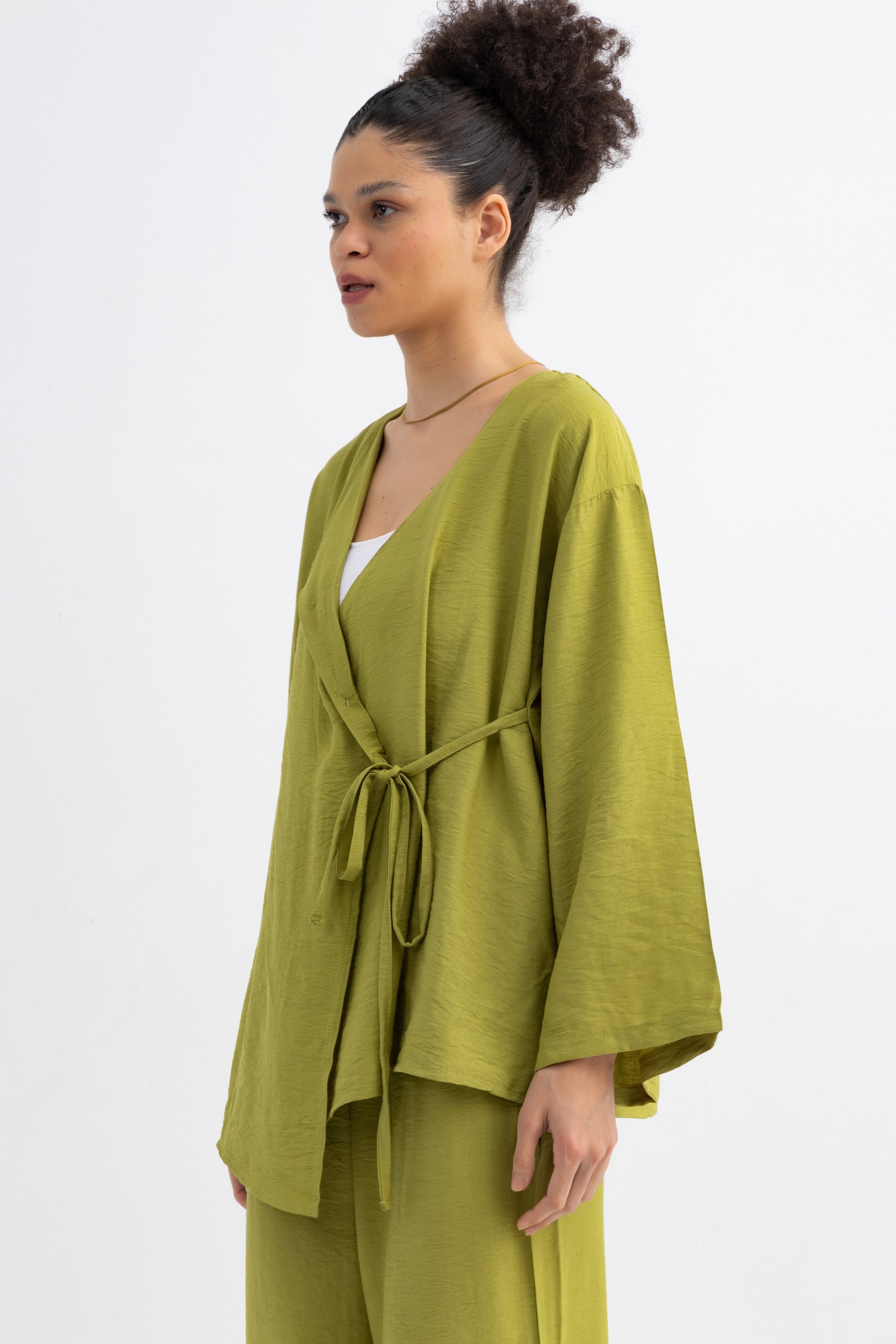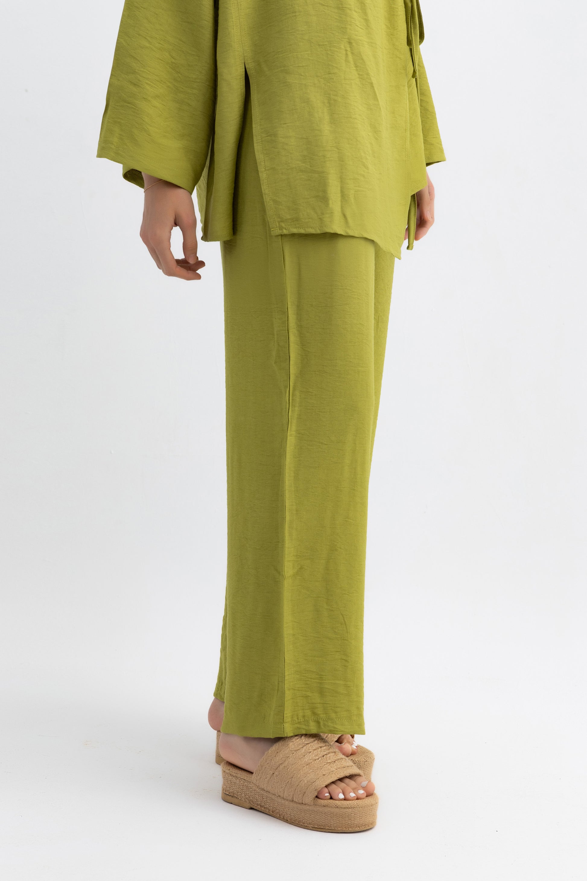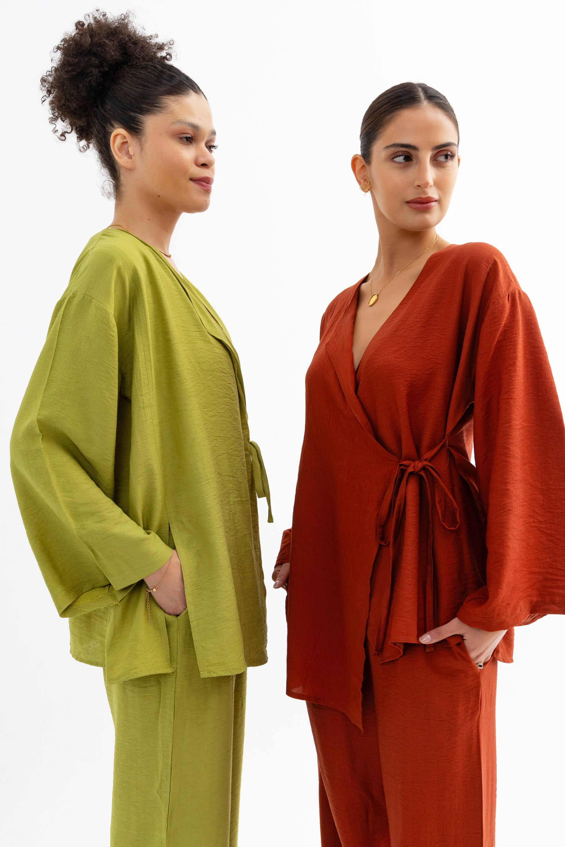 Fresh, lightweight, and full of character, this apple green wrap set is made from linen for breathable comfort and a naturally textured look. The top features a soft V-neck, adjustable side tie, and relaxed silhouette. Paired with wide-leg pants, this coordinated outfit offers effortless elegance with a bold, earthy twist.