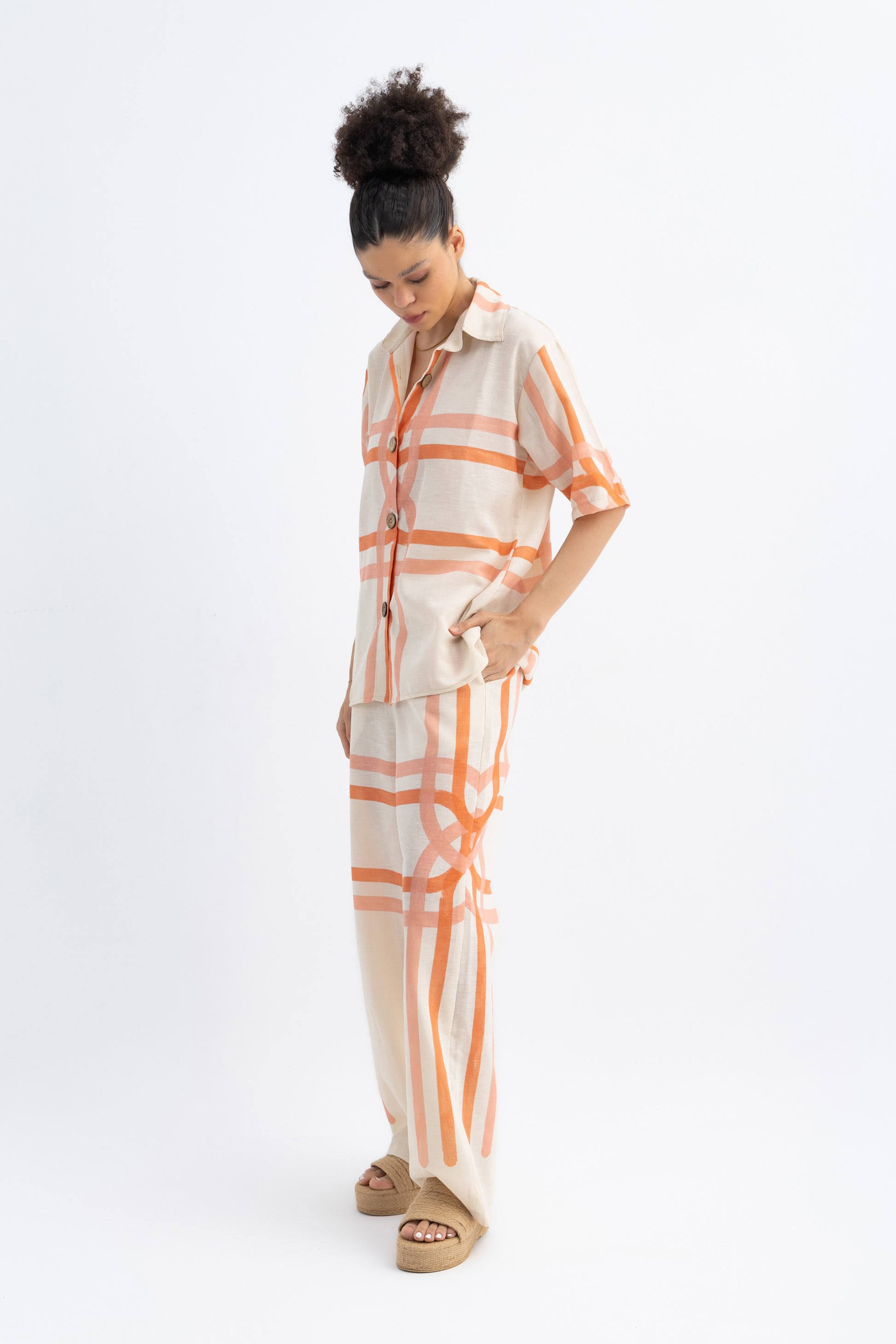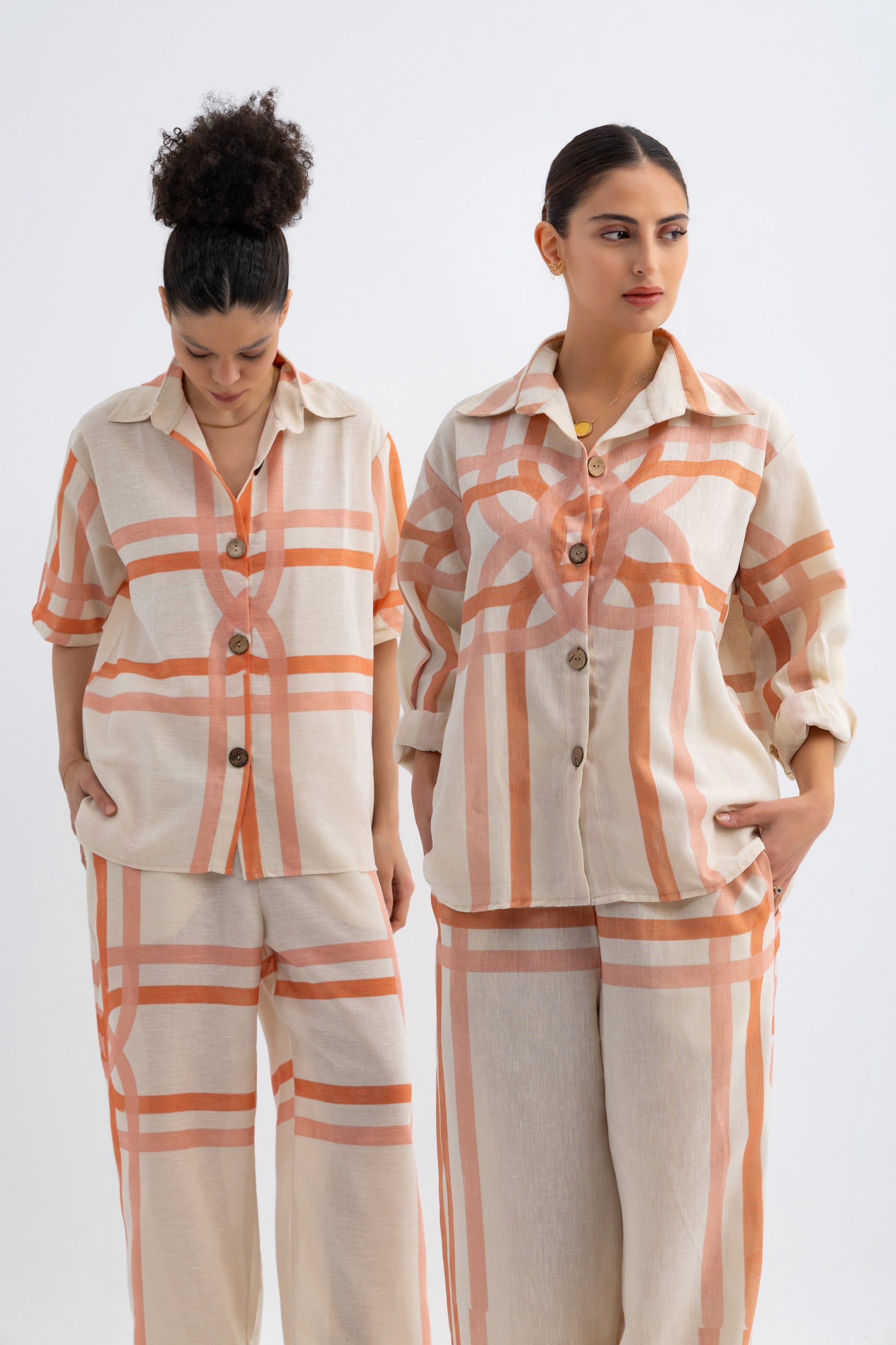 Make a statement in this breathable linen set featuring a bold sunset-inspired grid print in warm orange and blush tones. The set includes wide-leg full-length pants and your choice of a full-sleeve or short-sleeve shirt. Both shirts feature a relaxed, button-down design with natural wooden buttons. The pants are high-waisted with a relaxed fit and side pockets—designed for all-day ease with a striking visual twist.
