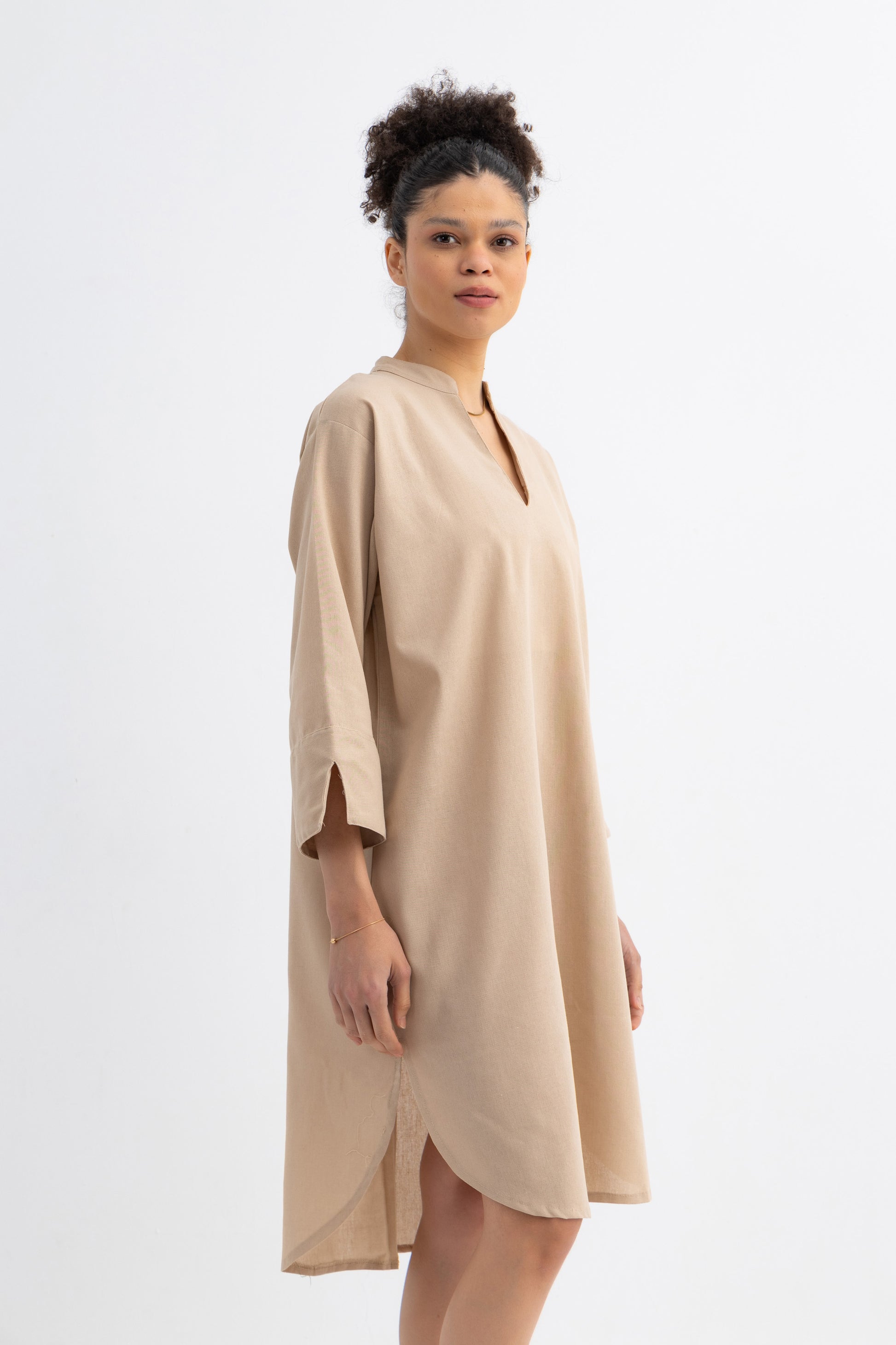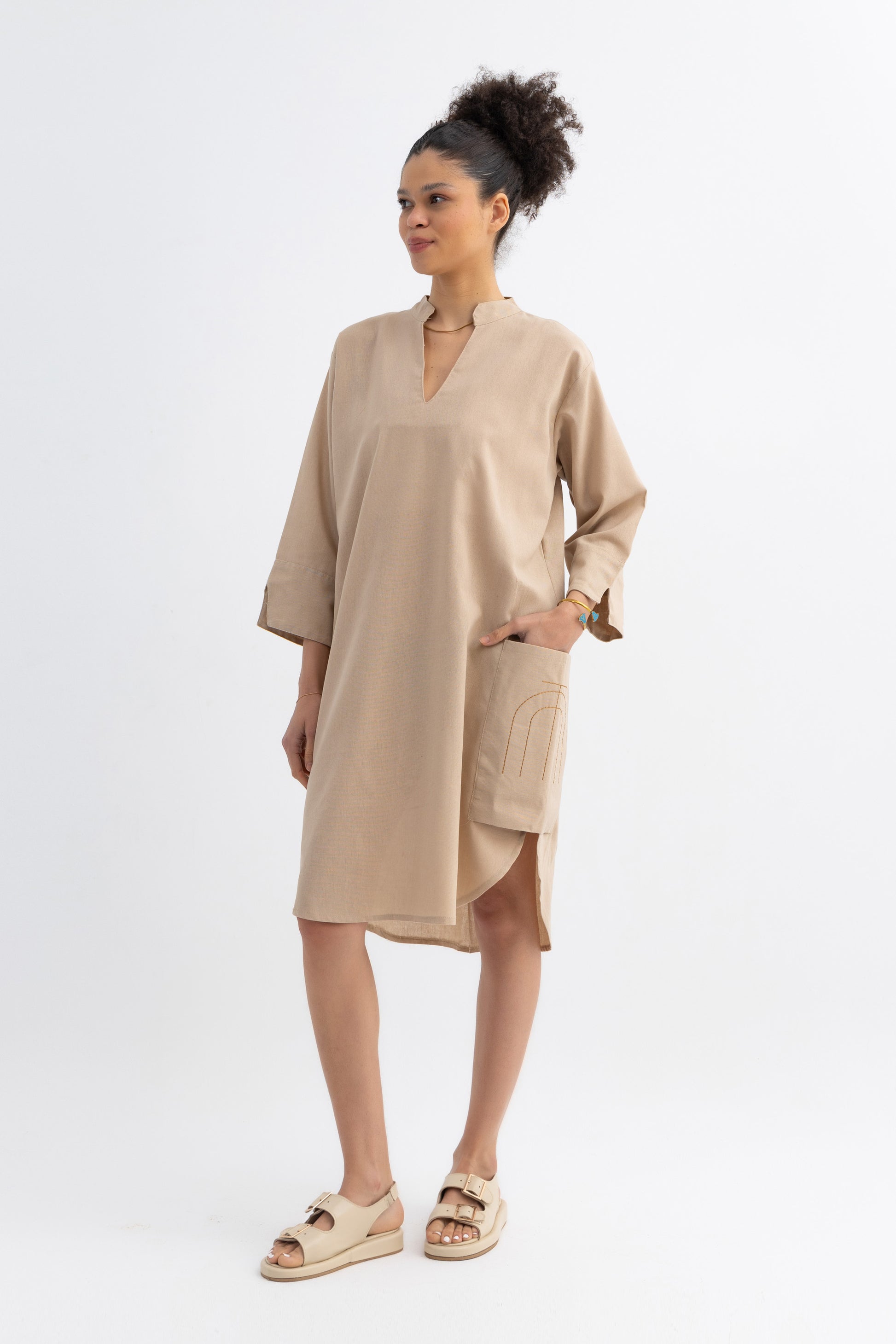 Channel timeless elegance with this Egyptian pharaoh inspired shirt dress, crafted from breathable linen. Its relaxed structure and straight silhouette nod to ancient tunic styles, while the deep notch neckline and oversized embroidered pocket add a modern, regal touch. The 3/4 sleeves and soft drape give it an effortless presence fit for queens of comfort and style.